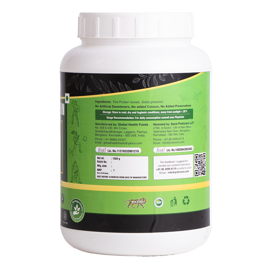 Pea Protein Isolate Pea Protein Isolate is a versatile protein that helps in body repair, build muscles effectively, aids in weight loss and best in bio-digestibility, bio-availability with natural cholesterol & saturated fat free. The serving size is 30 grams and each serving of Pea Protein Isolate Unflavoured consists of 24g Protein, 5.4g BCAA and 24mg magnesium. Pea Protein Isolate Unflavoured is available with the pack size of 1020g.